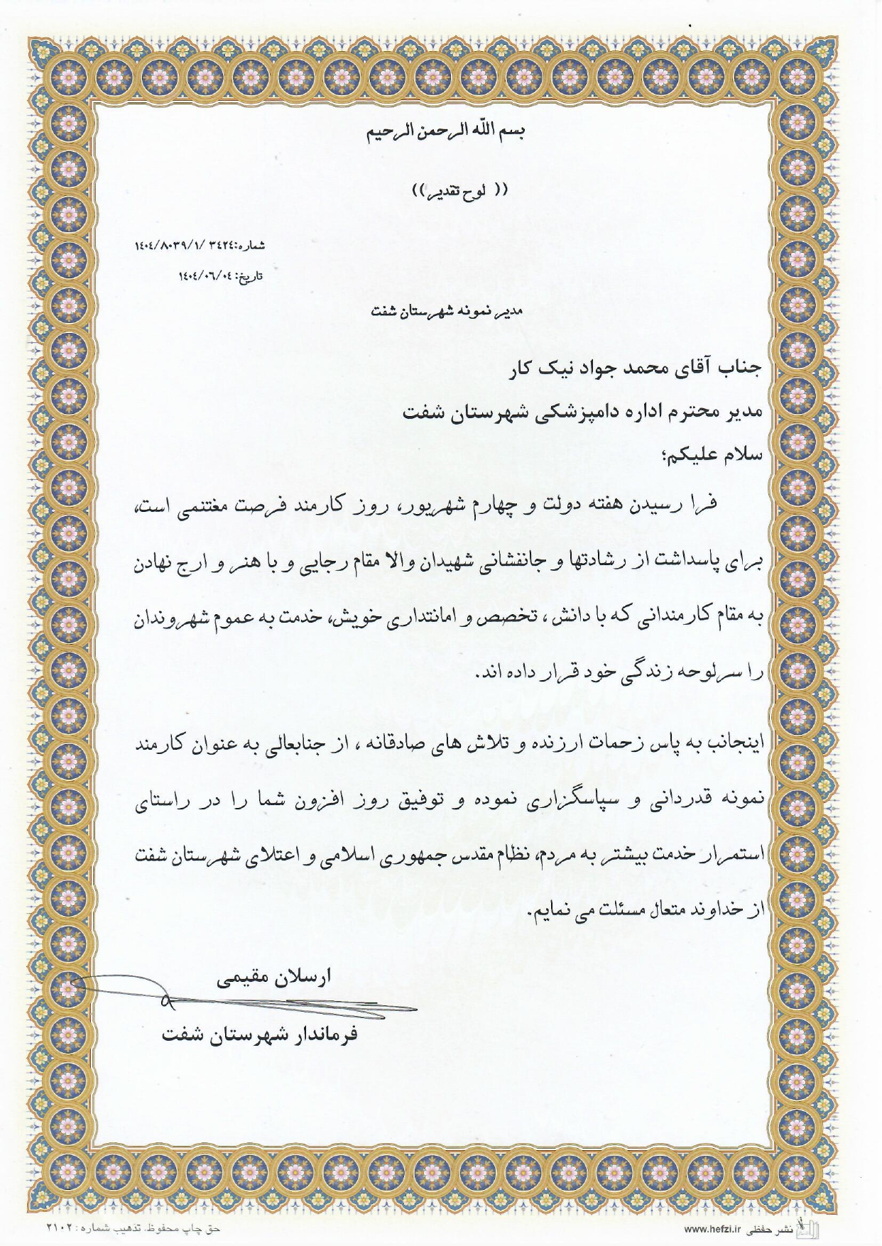 به گزارش روابط عمومی دامپزشکی گیلان، همزمان با هفته دولت و چهارم شهریور روز کارمند، ارسلان مقیمی فرماندار شهرستان شفت رئیس اداره دامپزشکی را به عنوان مدیر نمونه شهرستانی معرفی و از زحمات وی با اهدای لوح تقدیر و تشکر کرد.
