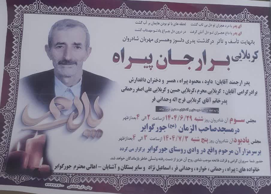 همکار گرامی جناب آقای محمود پیراه، درگذشت پدر گرامیتان را به جنابعالی و خانواده محترم و سایربستگان معزز تسلیت عرض نموده، از خداوند متعال برای آن مرحوم غفران و علو درجات و حشر با ائمه معصومین و برای شما و عموم مصیبت دیدگان، صبر و اجر جزیل مسئلت مینماییم.
